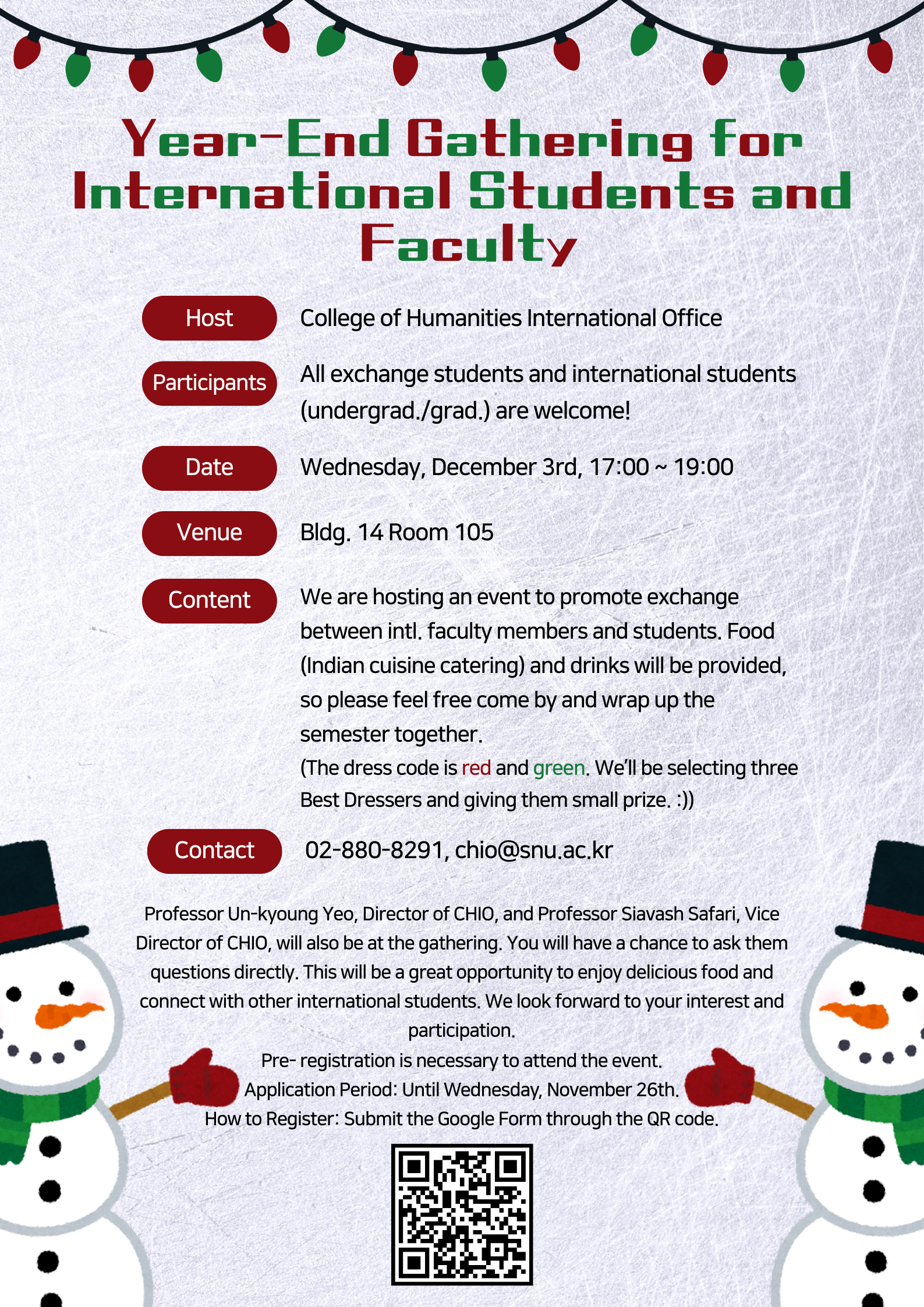 내용: 종강 즈음을 맞이하여 인문대학 소속 국제 교원 및 국제 학생 간의 교류를 위하여 행사를 진행하고자 합니다.